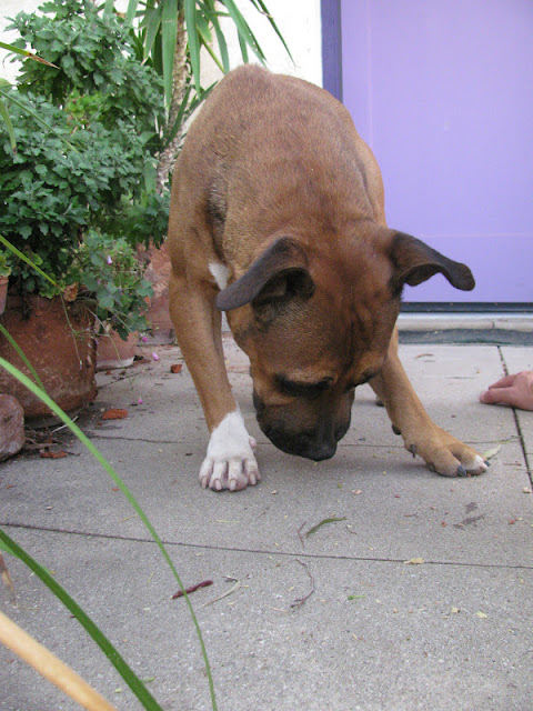 For the last couple of weeks a male pitbull has been wandering around my neighborhood. The first time I saw him, he growled at me and ran away. I quickly realized the poor guy didn't have a home and that he was hungry. Coincidentally, I have cans of catfood my cats won't eat, so when I saw him, I called him over and opened a can of food and left it out.